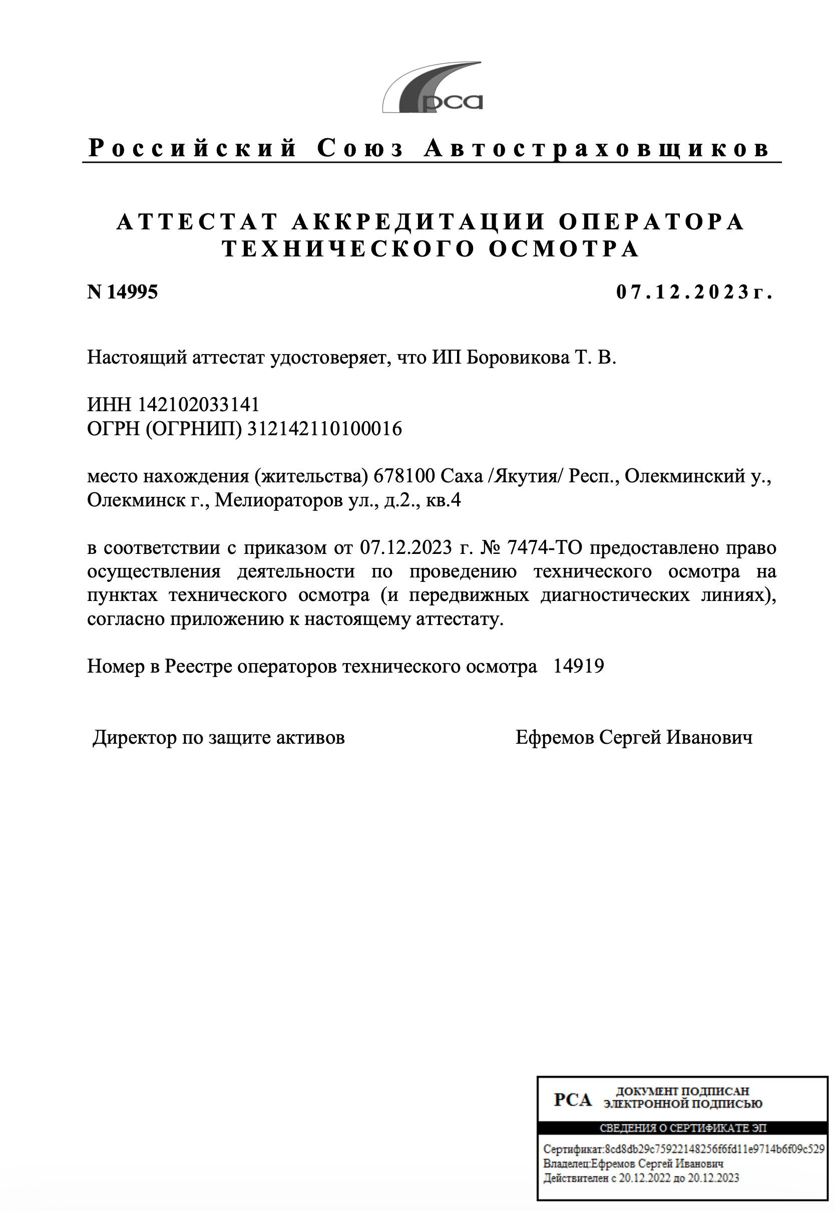 | Номер лицензии РСА | 14919 |